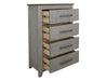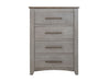 4 Drawer, Chest. The Ridge Chest features four spacious drawers, offering plenty of storage for all your bedroom essentials. It features sleek metal handles that enhance its modern aesthetic. Made from Melina and poplar wood, this collection guarantees durability and timeless appeal. The elegant light gray finish and brown tops blend seamlessly with any décor style. Additionally, the channeled design adds a touch of sophistication and texture to the furniture.