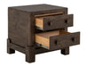 2 Drawer, Nightstand. Bring the beauty of nature indoors with the Dark Atenas Bedroom Set. Experience the harmony of style and functionality. Made from Mango and Melina wood, it features a multi-step lacquer finish that provides a smooth and polished appearance, making it not only aesthetic but also easy to maintain. The dark brown finish accentuates the wood's unique grain patterns, guaranteeing that each item is unique. The Atenas Nightstand features two drawers for ample storage. The simple wood-squared pulls on the drawers blend seamlessly with the overall modern rustic design. Standing on sturdy legs, this nightstand provides stability and a touch of rustic charm, perfect for elevating any bedroom decor.