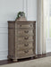 Merging traditional elegance with modern comfort, this chest of drawers takes your bedroom retreat to the next level. Serpentine curves, ash swirl veneer inlays and a glazed antiqued-look finish radiate timeless sophistication. Drawers are packed with ample storage possibilities. Talk about stunning refinement.