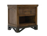 1 Drawer, 1 Shelf, Nightstand. Crafted from parota and engineered walnut wood, this nightstand from the Walnut Collection showcases timeless beauty and exceptional durability. It features a translucent multi-step lacquer finish in a rich reddish-brown tone, accentuating the wood's natural beauty and grain. The nightstand includes a single drawer with a metal handle for convenient storage and an open shelf space below for additional storage or display. The trim textured design on the base adds a distinct touch of sophistication and style to the collection. Transform your bedroom into a stylish sanctuary with the Walnut Bedroom set, where exceptional craftsmanship meets modern design.