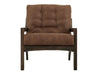 Wooden Frame, Upholstered Armchair. The Balam armchair features a wooden frame with a dark finish, offering a blend of modern style and timeless charm. The seat and backrest are upholstered in brown faux leather, accented with elegant button tufting for added sophistication. With its thick cushioning and sturdy structure, this armchair combines comfort and durability. Its refined design is perfect for lounging in style.