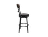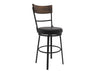 The stool includes a round cushioned seat upholstered in faux leather for added comfort. Its wooden backrest provides a warm, natural touch to the overall design, while horizontal metal bar enhance the modern aesthetic and offer additional support.