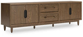 Introducing a TV stand inspired by the architectural language of mid-century expression. Its spacious cabinets and drawers provide ample storage, while a sleek design allows the natural beauty of the wood to shine through. Ready for a cinematic experience? This entertainment center is perfect for movie nights and relaxation.