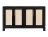4 Door, Console. Bring warmth and character to your home with the Solara Console, expertly handcrafted from solid Melina wood and finished in a lacquer. The door panels are adorned with woven yucca fiber, and the base features CNC-machine textured, providing a touch of organic charm and elegance. It features two shelves for practical storage and custom metal pulls; the Solara seamlessly combines artistic details with functional design, crafted to be cherished for a lifetime.