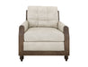 Wooden Frame, Upholstered Armchair. Transform your living space with this stunning wooden-framed armchair that perfectly combines craftsmanship and comfort. The Xel-Ha II Collection features tufted back cushions upholstered in ivory leather-like fabric, providing plush support and an elegant touch. The decorative throw pillows add a charming and warm accent to the overall design. What truly sets this collection apart is its beautifully designed, gently curved armrests, enhancing its aesthetic appeal and ergonomic comfort. The turned wooden legs, with their intricate detailing, showcase timeless sophistication. Redefine your space with furniture that makes a statement because every home deserves a touch of artistry.
