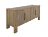 4 Doors, Console. The Luma Console is a beautifully crafted piece of furniture made from melina wood. Its warm sand-brown finish highlights its natural and earthy appearance and visible grain patterns. This sturdy piece has a simple yet elegant design, including four doors with an overlay hinge mechanism for gentle and quiet closing. The rectangular handle in the center allows easy access to the storage compartments, revealing shelves inside. This design reflects a clean and functional aesthetic.
