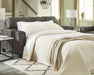 If you love the cool look of leather but long for the warm feel of fabric, you can take comfort in this queen sofa sleeper. Wrapped in a fabulous faux leather with a weathered hue and hint of pebbly texture to resemble the real deal, this decidedly modern sofa proves less is more. Elements include angled side profiling and track armrests wrapped with a layer of pillowy softness for that little something extra. Prominent jumbo stitching and clean-lined divided back styling lend fashion-forward flair. Rest assured, the queen memory foam mattress comfortably accommodates overnight guests.