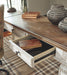 Elevating the art of traditional cottage styling, this L-shaped desk is your heavenly home office realized. Two-tone finish combines chipped white with distressed wood tone tops for added charm. Framed drawer fronts, decorative corbels and elegantly turned and tapered legs add refinement, while dark bronze-tone knobs lend a classic touch. Spring lift top raises the surface to a comfortable standing position, for a healthy alternative. Built for looks and productivity, the built-in power supply and dual USB ports keep your devices close at hand and ready to go.
