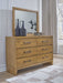 If you appreciate minimalistic style, this dresser and mirror set is the ideal option. Its soft and simple finish has a laid-back sensibility, blending relaxed contemporary design with a trendy allure. The spacious drawers are accented with stylish metal drawer pulls in a darkened bronze tone. What a delightful addition to your casual-chic decor.