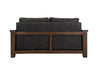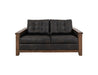 Wooden Frame, Upholstered Loveseat. Step into comfort and make this loveseat the focal point of your living room. The Walnut loveseat features a sturdy wooden frame with a rich brown finish and wide, flat armrests. Both the seats and backrest are upholstered in a dark, leather-like material. The backrest showcases a tufted design adorned with buttons, adding an elegant touch. Diagonal wooden supports on the sides enhance its modern rustic charm, blending the warmth of wood with the sleekness of dark upholstery.